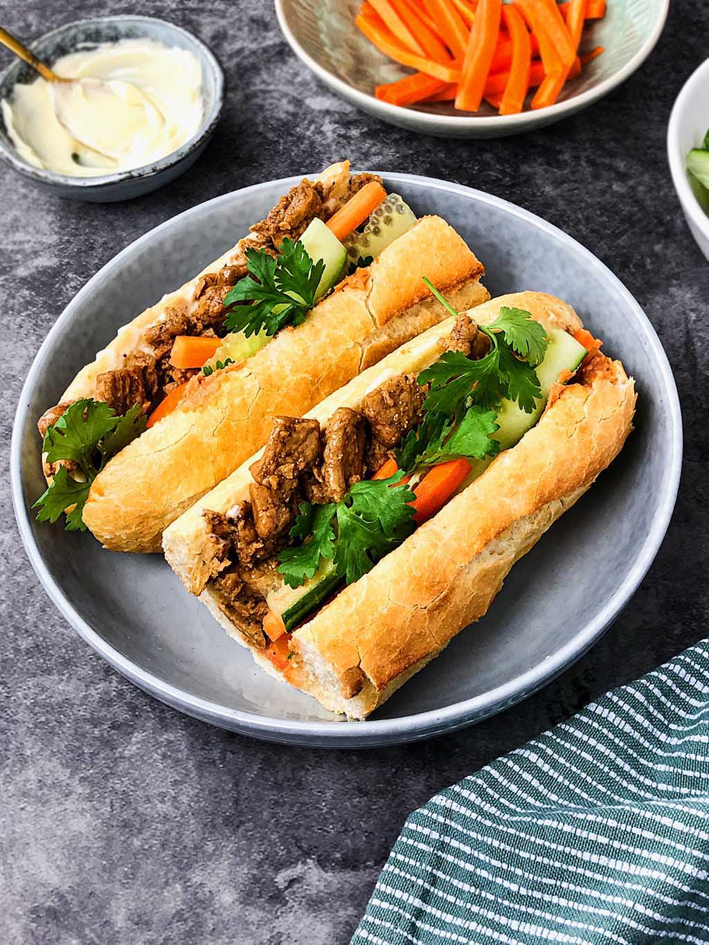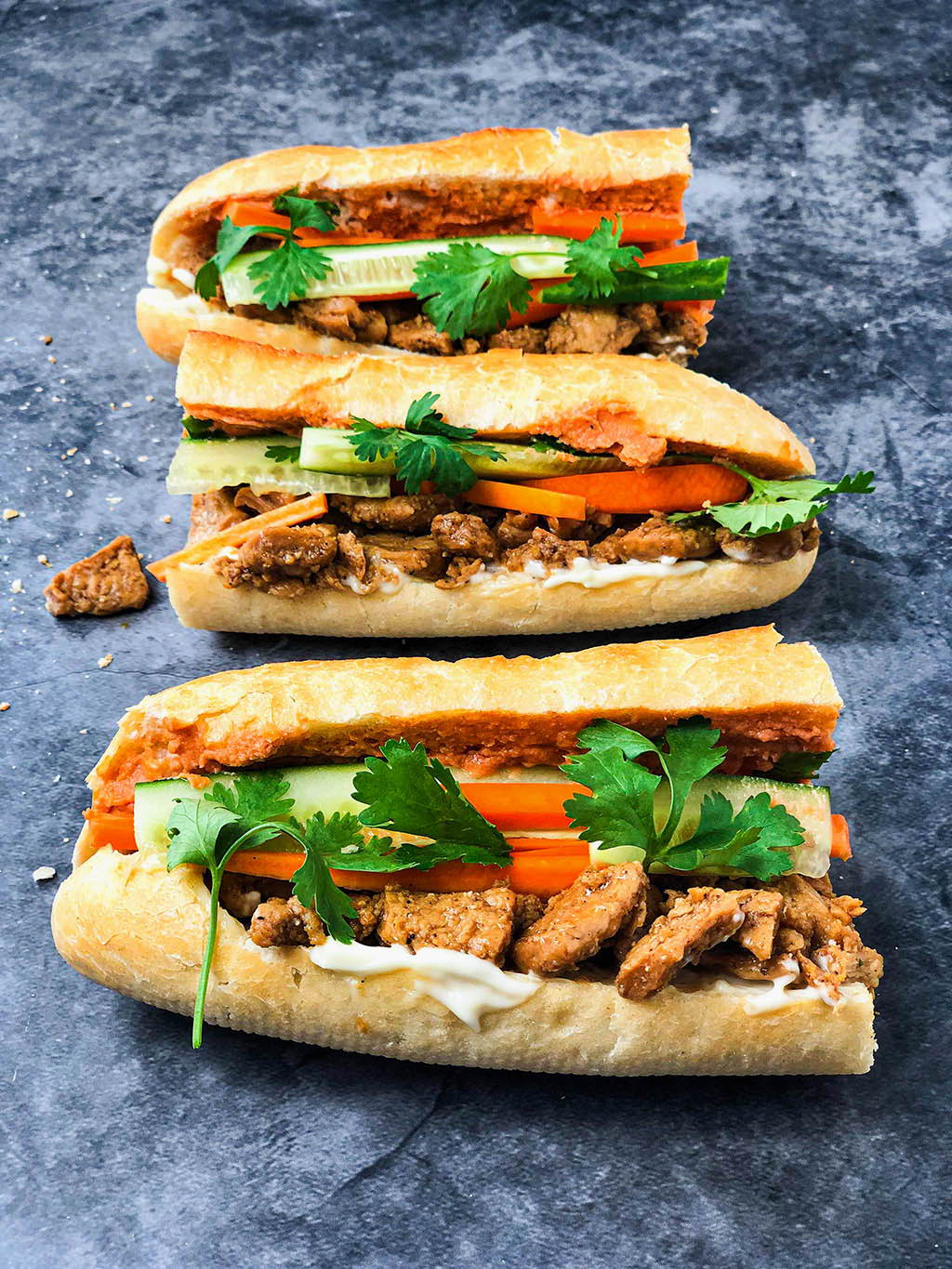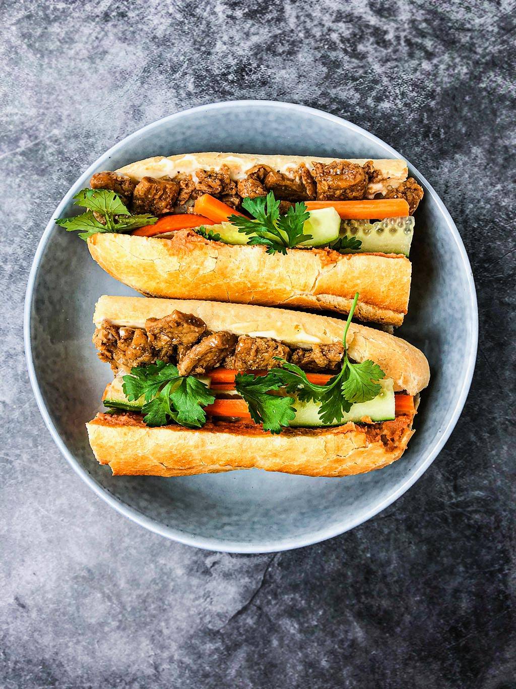 In Vietnam entwickelten sie ihre eigene Methode, um das französische Baguette luftiger und innen weicher von innen zu machen. Dies wurde durch die Verwendung einer Mischung aus Reis- und Weizenmehl erreicht. Die Kruste ist knusprig, aber viel dünner. Die Füllung besteht oft aus verschiedenen Fleischsorten, eingelegtem Rettich, Karotten oder Gurken, Pastete, Mayonnaise und frischem Koriander. Manchmal wird auch etwas Sriracha-Sauce hinzugefügt, um dem Sandwich einen zusätzlichen asiatischen Kick zu verleihen. Dieses Sandwich ist sehr beliebt und in Vietnam an jeder Straßenecke erhältlich. Und wie du es dir denken kannst, hat auch hier jeder seine eigene Variante.