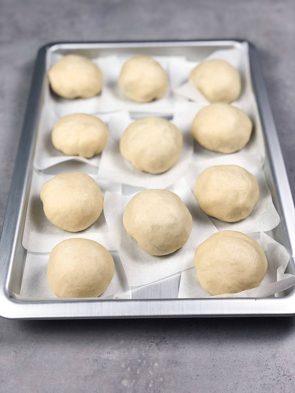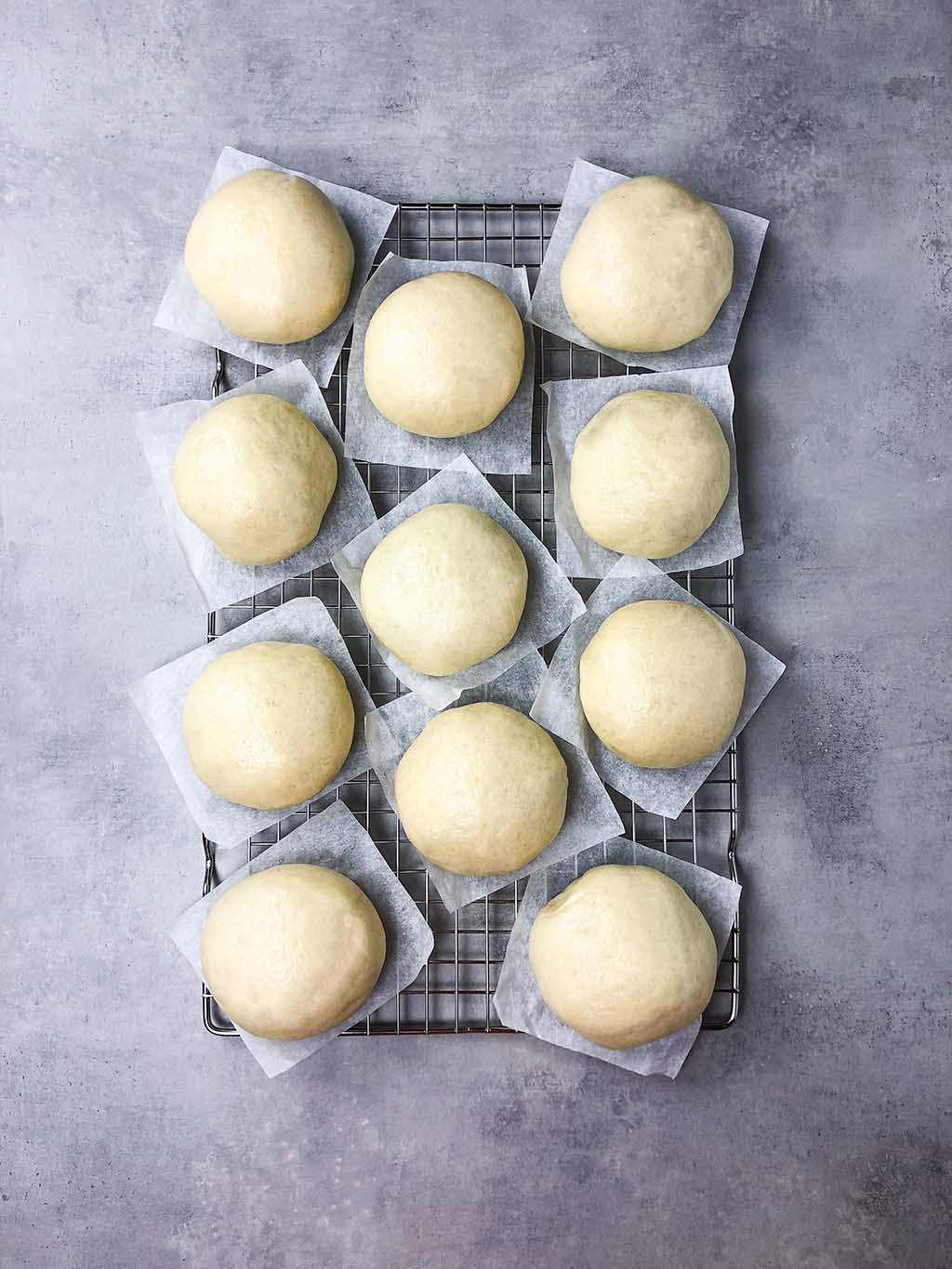 Nimm eine Teigkugel (beginne mit der Kugel, die du zuerst geformt hast, da sie bereits am längsten gegangen ist) und ziehe vorsichtig am Ende des Teigs, um einen größeren Kreis zu formen. Die Innenseite bleibt dadurch etwas dicker und die Außenseite etwas dünner. Lege den Teigkreis in deine Hand und lege 1 bis 2 Esslöffel Füllung in die Mitte. Drücke es leicht mit dem Löffel an, während du mit deiner Hand eine Schale formst. Falte nun die Außenseite des Teigs in der Mitte zusammen und drücke sie fest zusammen. Achte darauf, den Teig gut zusammenzudrücken, damit keine Füllung beim Dämpfen entweichen kann. Lege nun die zusammengedrückte Unterseite in deine Hand und forme sie sanft mit beiden Händen zu einer schönen runden Kugel (siehe Video für die Technik). Lege jede Kugel auf ein Stück ausgeschnittenes Backpapier. Lege sie auf ein Tablett und decke sie mit einem feuchten Geschirrtuch ab. Lasse sie 20 Minuten an einem warmen Ort ruhen.
