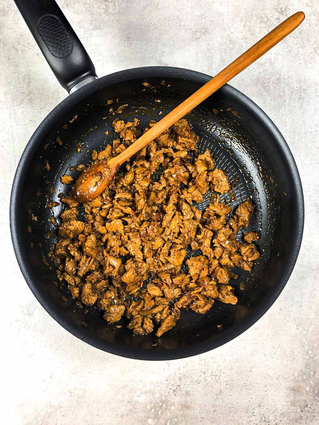 Für die Füllung braten wir Zwiebel und Knoblauch in der Pfanne an und fügen Wasser, Sojasauce, süße Sojasauce (Ketjap Manis) und getrocknete Peas Maker Stücke hinzu. Dies lassen wir so lange einkochen, bis alle Aromen gut in die Peas Maker Stücke gezogen sind und die meiste Flüssigkeit verdampft ist. Eventuell mit etwas Salz und frisch gemahlenem schwarzen Pfeffer abschmecken. Anschließend machen wir die Stücke mit einem Holzlöffel etwas kleiner.