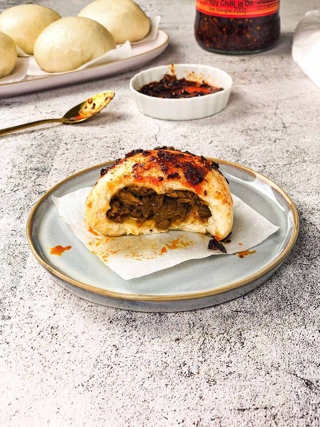 Da wir die Füllung bereits sehr lecker finden, essen wir sie normalerweise nicht mit Sauce. Aber seitdem wir Crispy Chilli in Oil entdeckt haben, schmieren wir das gerne auf die veganen Bapao. Wirklich, so lecker! Dieses Crispy Chilli in Oil ist von Lao Gan Ma und wird online und in vielen Asia-Shops verkauft. Wenn du also einen Asia-Shop in deiner Nähe hast, ist das wirklich zu empfehlen. Und natürlich ist diese Sauce auch komplett vegan!