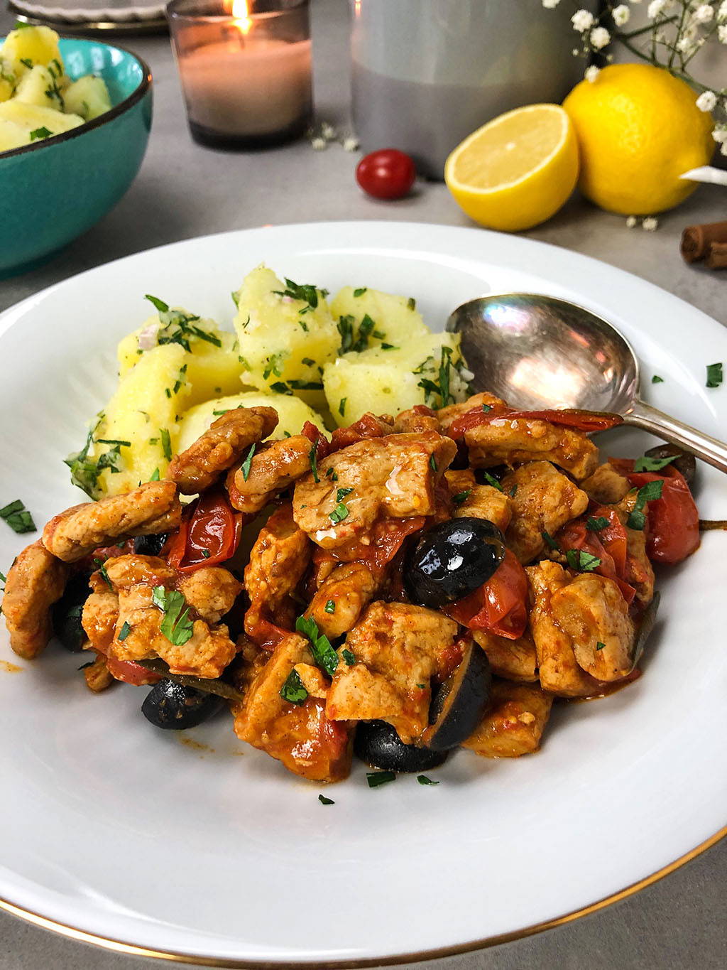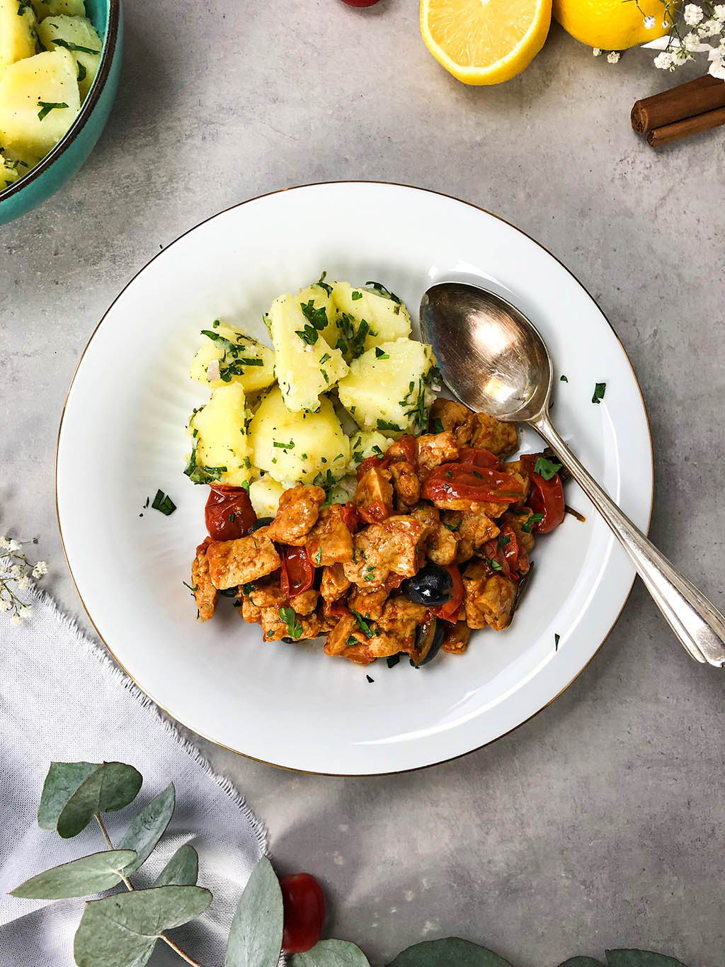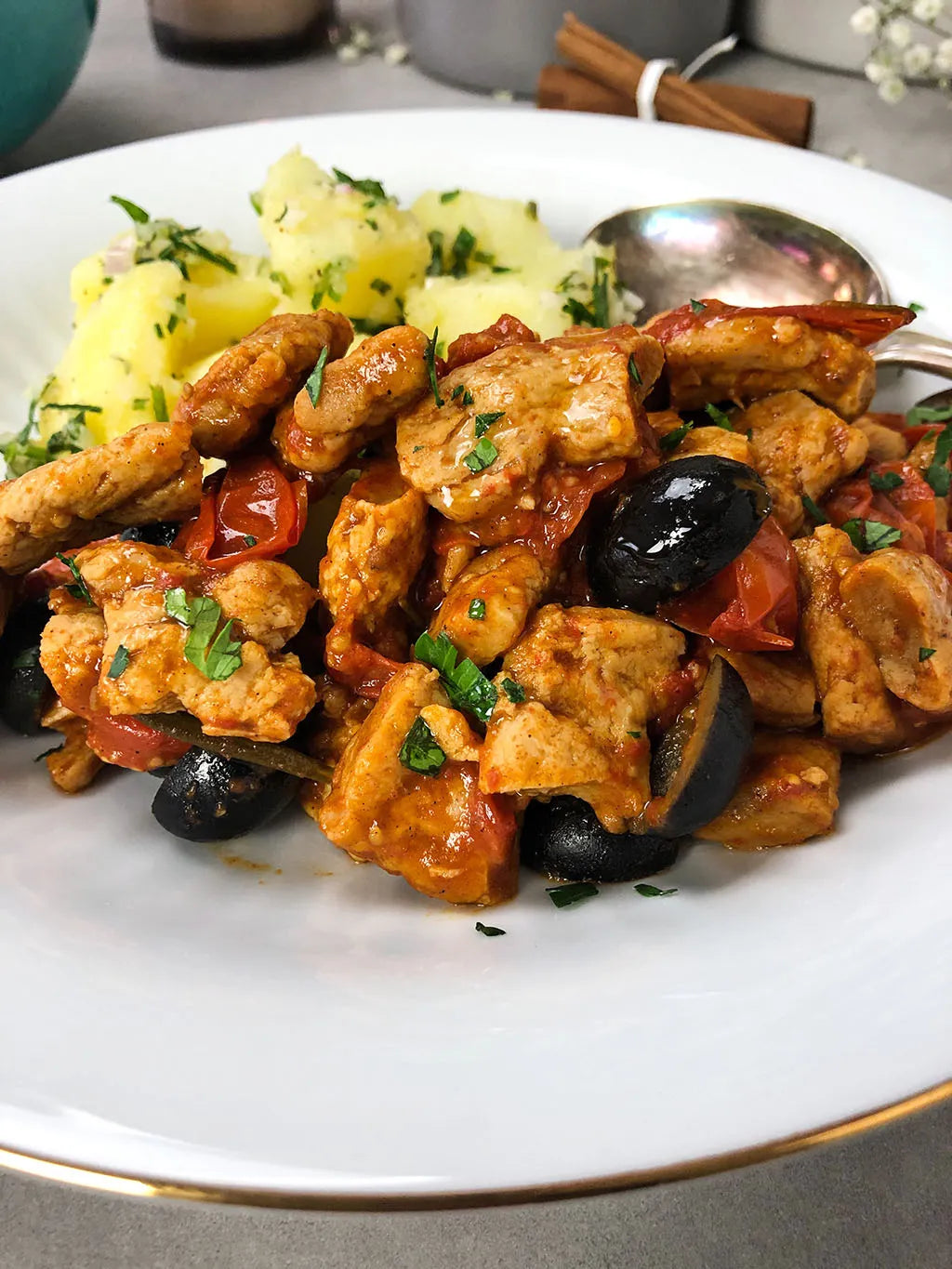 Es ist sehr einfach, einen kalten Kartoffelsalat zuzubereiten. Du kannst diesen auch gut im Voraus zubereiten. Wir mögen es immer, geschnittene Schalotten, geschnittene frische Petersilie, Olivenöl, frisch gemahlenen schwarzen Pfeffer und etwas Salz hinzuzufügen. Du kannst alles auch gerne mit etwas Zitronensaft beträufeln, um es extra erfrischend zu machen. Du kannst das vegane Cacciatore auch gut mit knusprigen Kartoffeln oder Kartoffelpüree essen. Aber wenn du Lust auf Reis, Pasta oder Baguette hast, geht das natürlich auch.