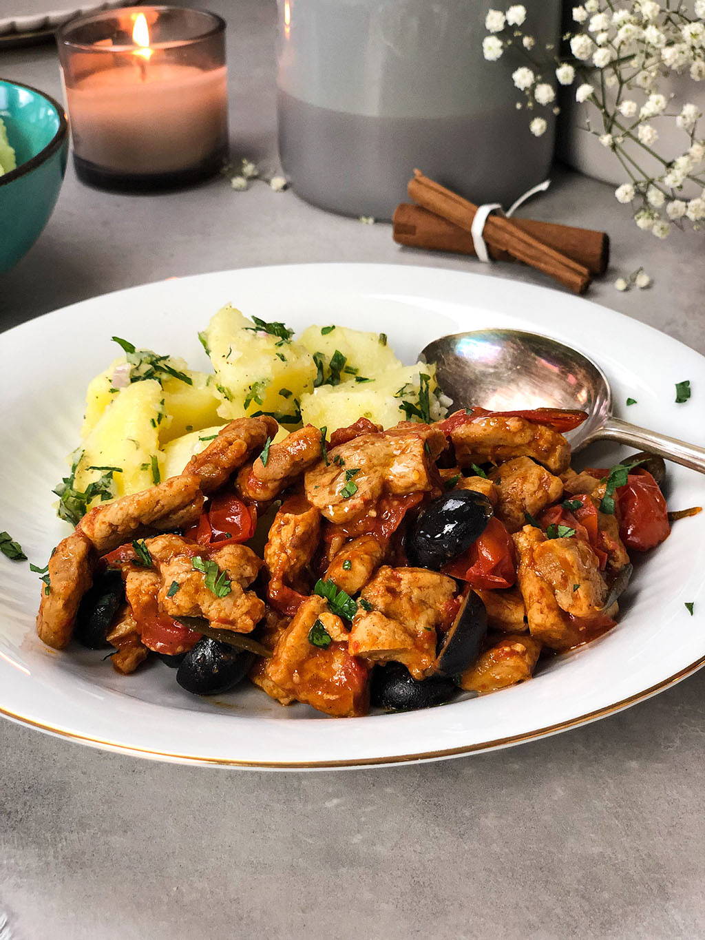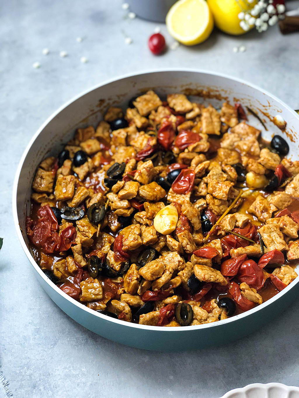 Zum Schluss fügen wir die halbierten schwarzen Oliven hinzu, zusammen mit etwas Agavensirup. Das lassen wir kurz mitkochen, und dann servieren wir das vegane Cacciatore sofort. Schmeckt gut, zum Beispiel mit einem kalten Kartoffelsalat.
