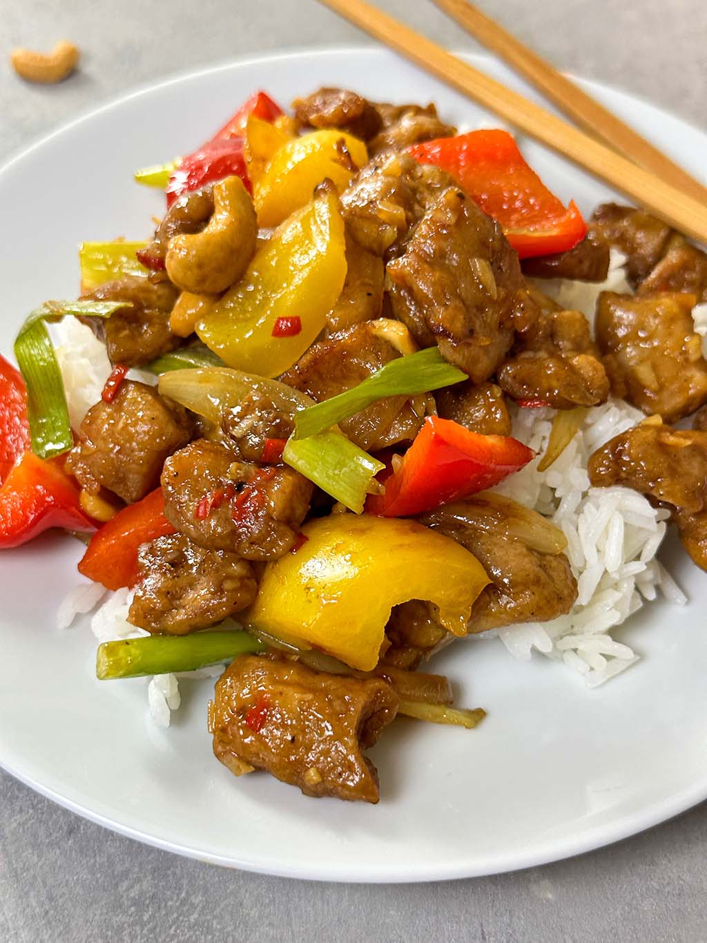 Es ist sehr einfach, aus diesem Gericht eine vegane Version zu machen. Die Hühnerstücke ersetzen wir einfach durch die Peas Maker Stücke. Unten erklären wir dir gerne, wie du veganes Hähnchen-Cashew ganz einfach zu Hause zubereiten kannst.