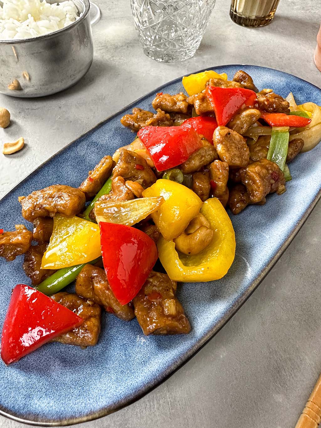 Hähnchen mit Cashew wird oft mit gedämpftem Reis oder Nudeln serviert, was es zu einer sättigenden Mahlzeit macht. Es ist ein beliebtes Gericht in vielen asiatischen Restaurants und wird weltweit für seinen Geschmack und seine einfache Zubereitung geschätzt.