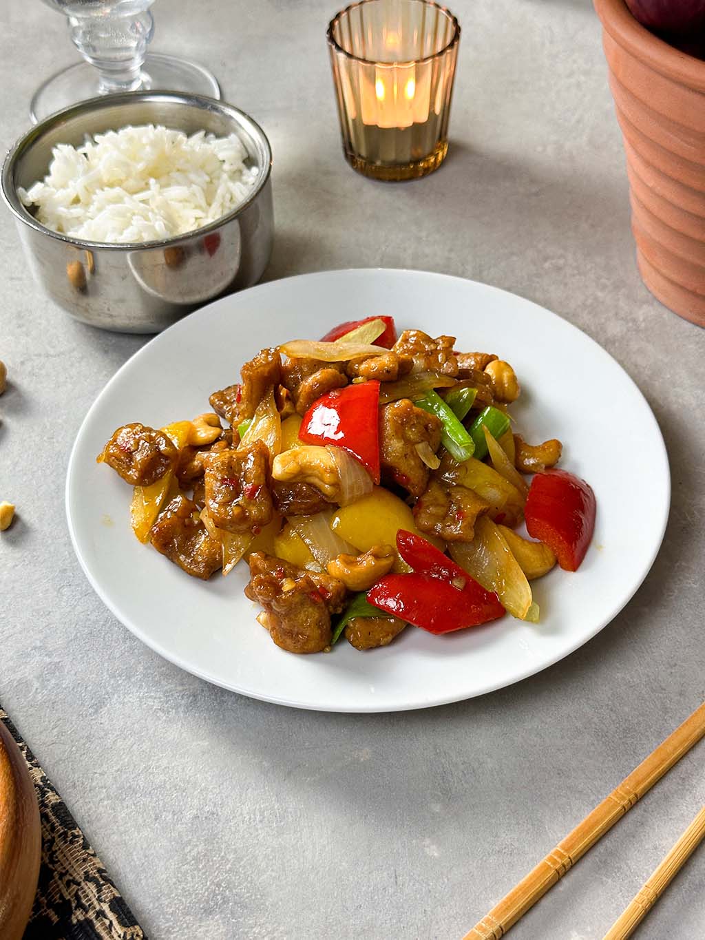 Natürlich kannst du je nach Vorlieben Beilagen variieren. Das Wichtigste ist, dass sie gut zu den Geschmacksrichtungen und der Konsistenz von veganem Hähnchen-Cashew passen.