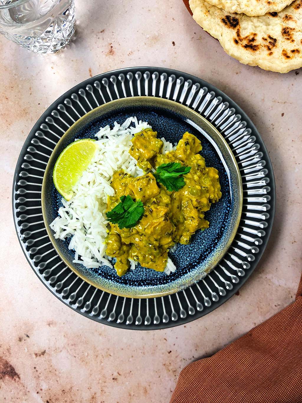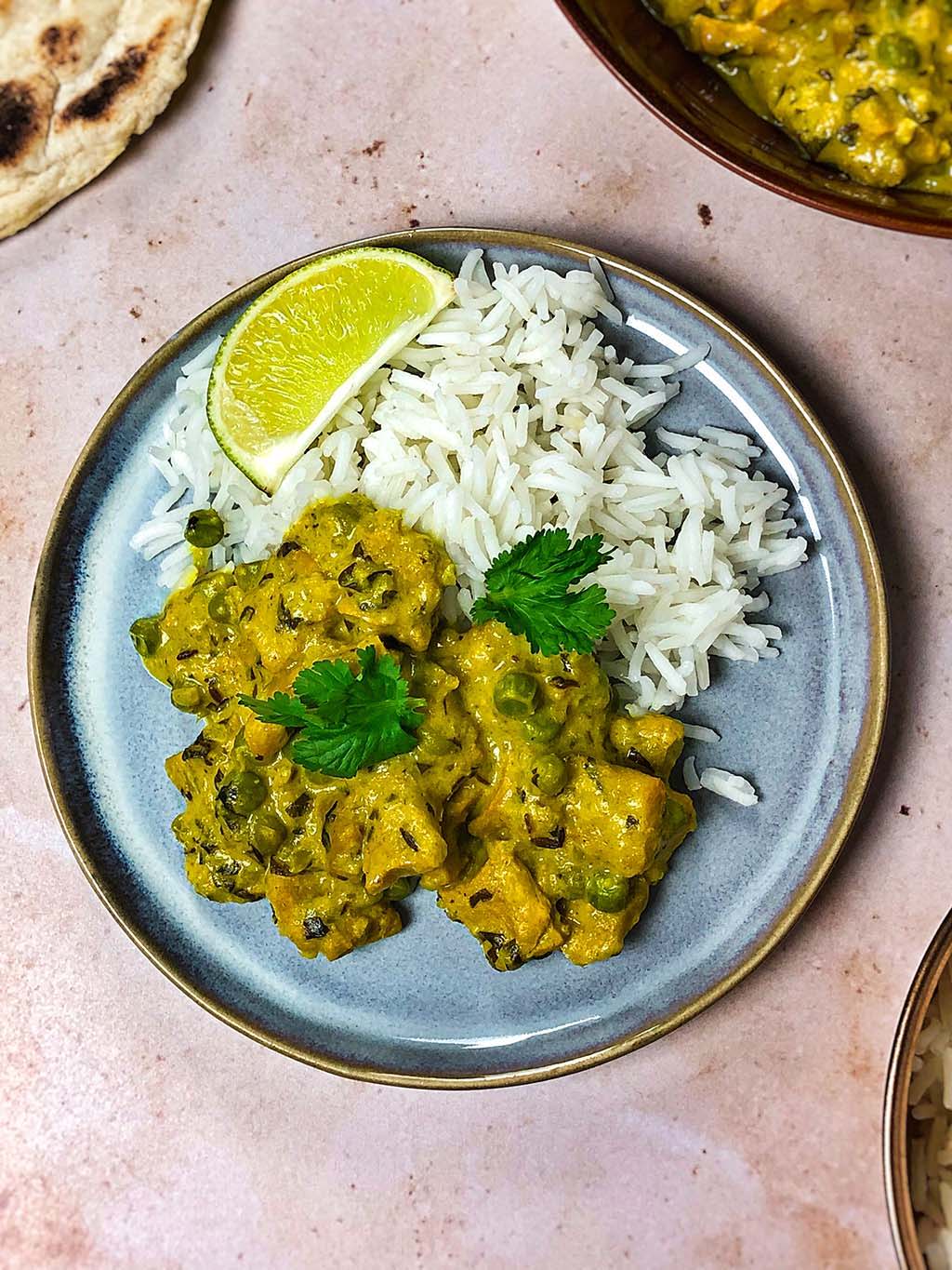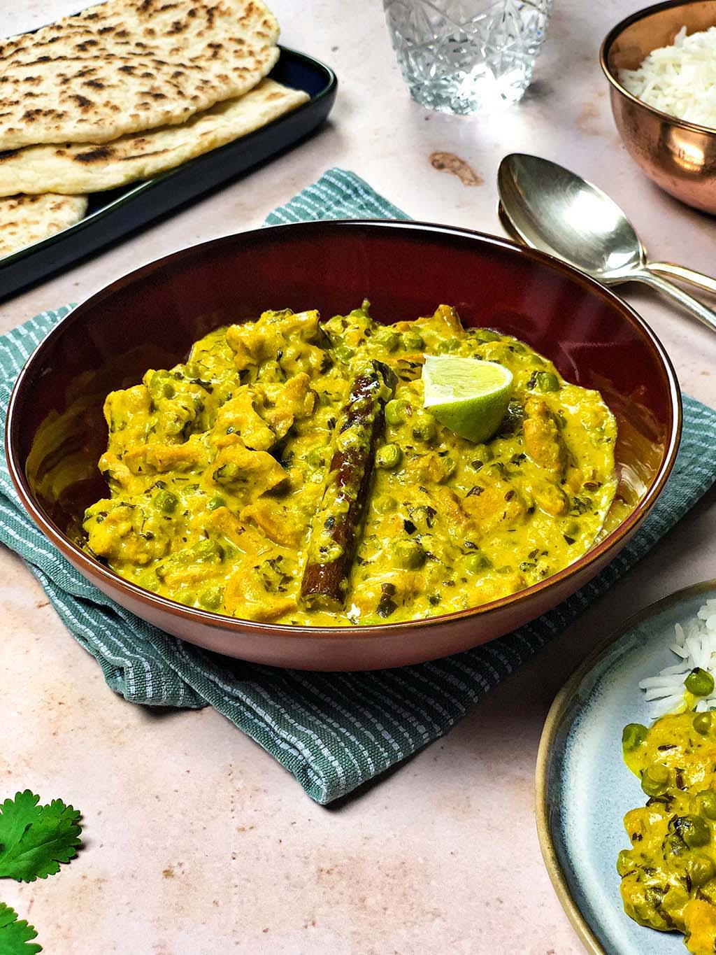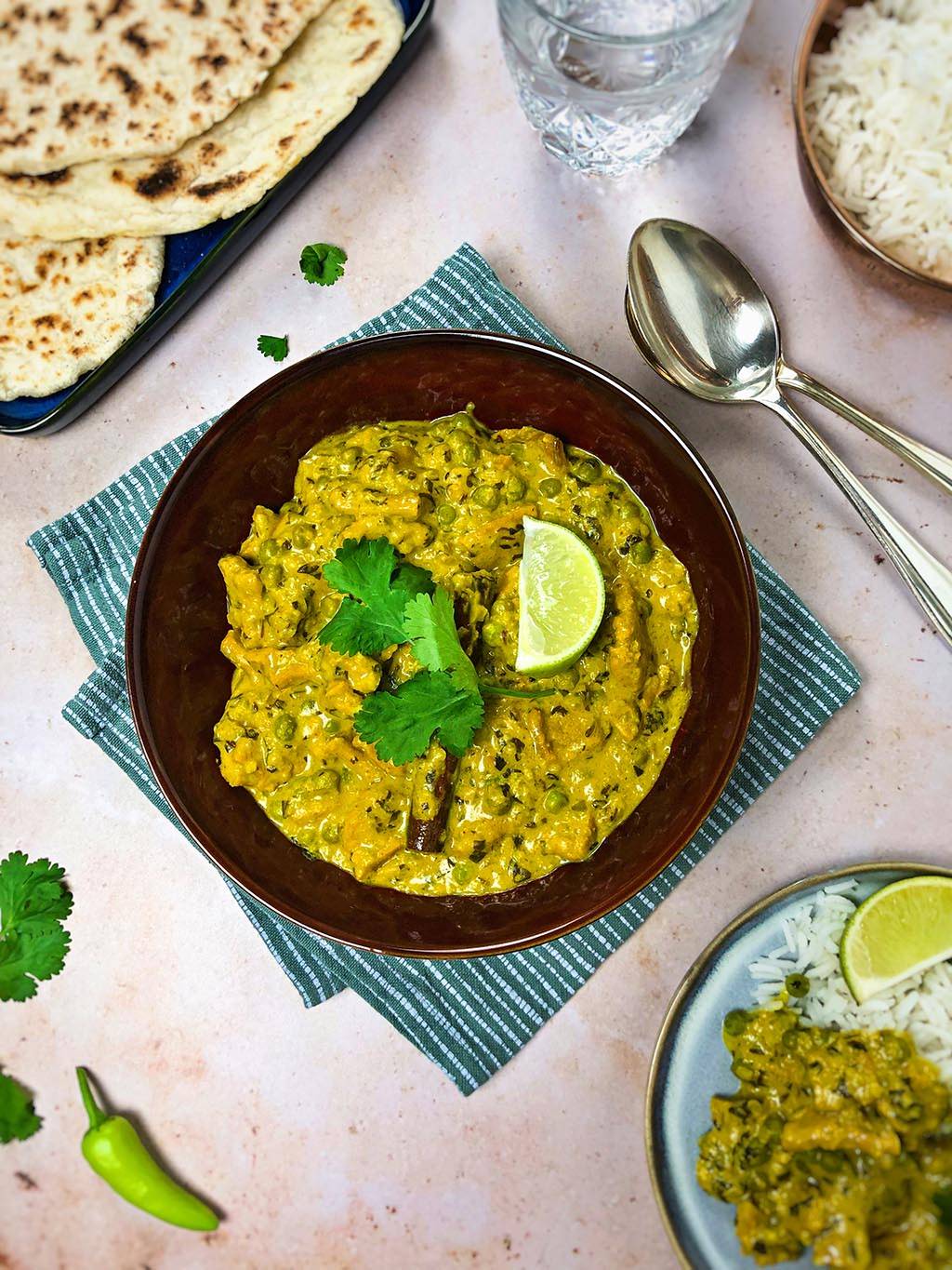Dieses vegane Korma-Curry schmeckt gut mit Reis und selbstgemachtem Naanbrot. Außerdem servieren wir das Curry mit einigen Limettenstücken und frischem Koriander. Du kannst es aber auch gerne mit Mango-Chutney essen, je nachdem, was dir schmeckt.