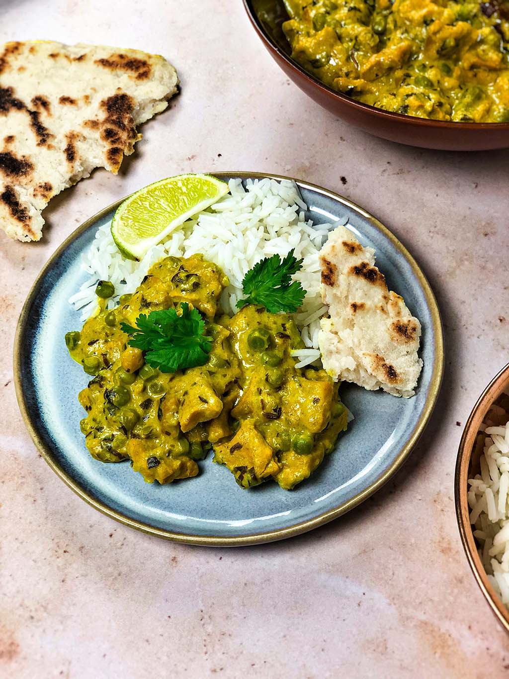 Füge zuletzt die Erbsen und den Kokosjoghurt hinzu. Rühre alles gut um und lasse es weitere 2 Minuten mitkochen. Serviere mit Reis, Naanbrot, Limettenstücken und garniere es gegebenenfalls mit etwas zusätzlichem frischem Koriander.