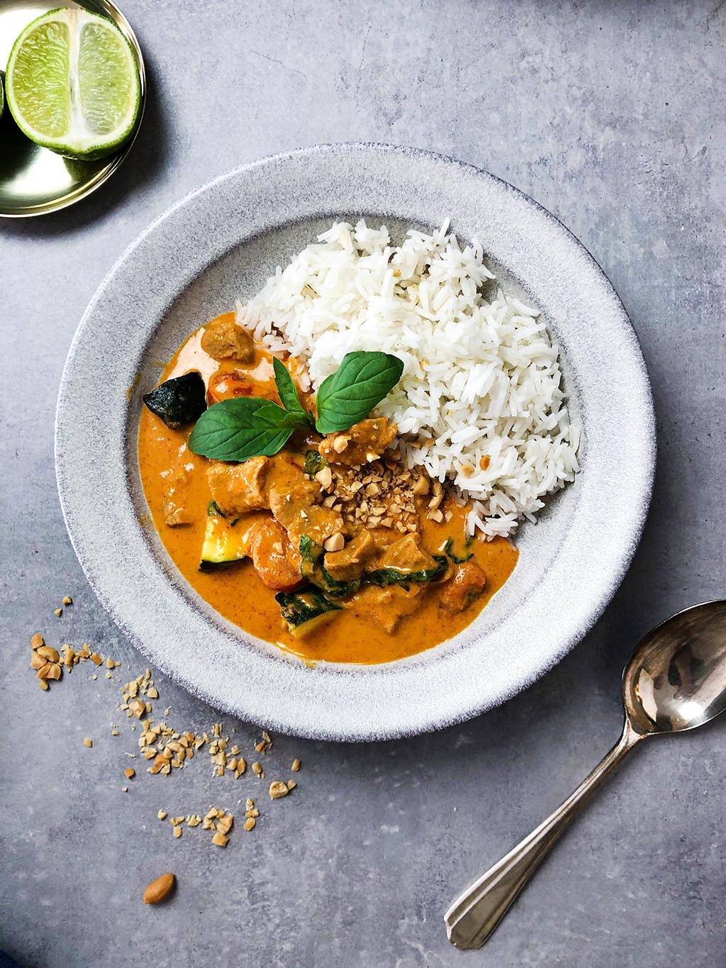 Um die Sauce noch cremiger zu machen, wird Kokosmilch hinzugefügt. Normalerweise wird für Panang Curry Hühnchen oder Schweinefleisch verwendet. Aber man sieht auch manchmal, dass Fisch verwendet wird. Für die vegetarische und vegane Variante wird oft Tofu oder zusätzliches Gemüse gewählt.