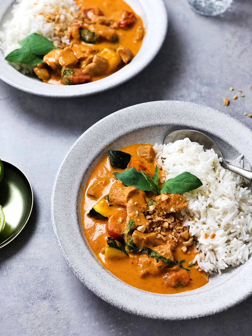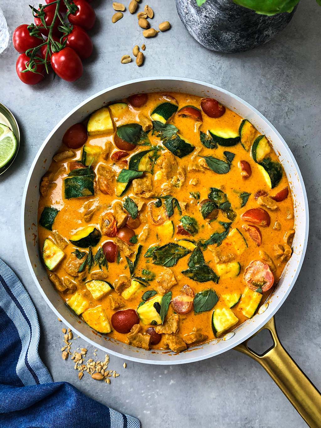 Die Sauce ist cremig, zart, süß und ein wenig würzig. Die Kombination mit den Peas Maker Stücken, der Zucchini und den Kirschtomaten macht dieses Curry komplett. Genieße es mit Jasminreis und garniere es mit gerösteten Erdnüssen. Dieses vegane Panang Curry ist eine wahre Geschmacksexplosion im Mund und dadurch süchtig machend lecker. Du kochst alles in einem Topf und das in nur 25 Minuten. Einfach, schnell und lecker für alle.