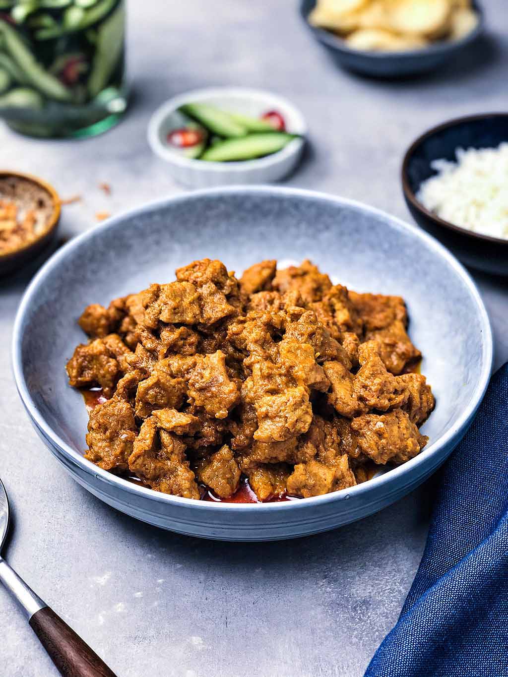 Rendang kann jetzt wunderbar mit verschiedenen Gemüsesorten serviert werden, aber wir essen es gerne mit Reis, süß-saurer Gurke und veganen Krupuk. Ja, du hast richtig gelesen, veganer Krupuk. Aber du kannst du es auch mit Cassava-Krupuk oder Emping genießen. Alles vegan, sojafrei und glutenfrei und alles lecker zum Essen mit dem veganen Rendang.