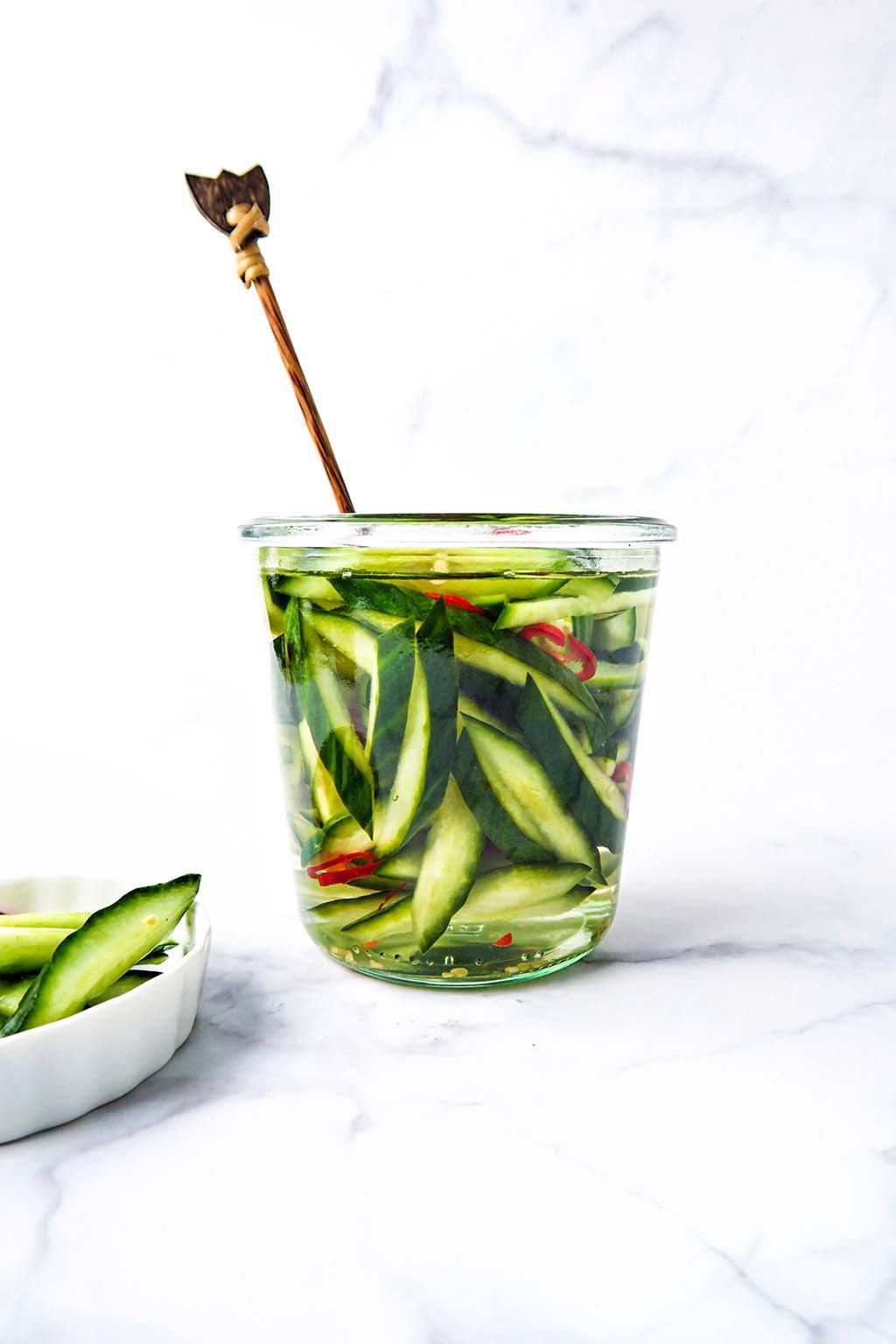 Schneide eine große Gurke der Länge nach in Hälften und dann noch einmal der Länge nach in Hälften. Entferne die Kerne und schneide die Gurke dann schräg in Streifen. Gib die Gurke in eine Schüssel oder ein Glas. Füge nach Belieben einige dünne Scheiben rote Paprika hinzu. Gib nun 250 ml Wasser, 95 g weißen Zucker und 125 ml Apfelessig in einen kleinen Topf und bringe es zum Kochen. Wenn der Zucker geschmolzen ist, gieße alles über die Gurke, bis die Gurke vollständig bedeckt ist. Lasse es zuerst vollständig abkühlen und bewahre es dann gut verschlossen im Kühlschrank auf. Dies bleibt mindestens eine Woche lang frisch.
